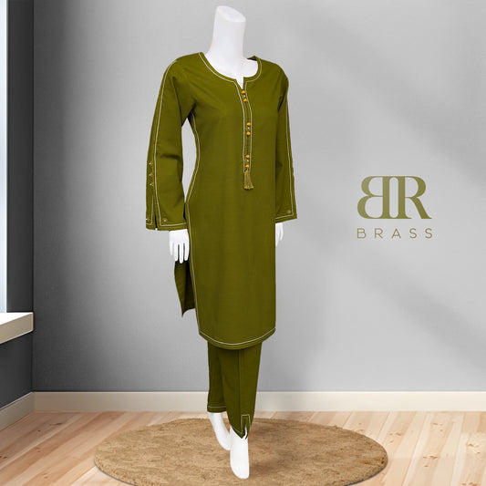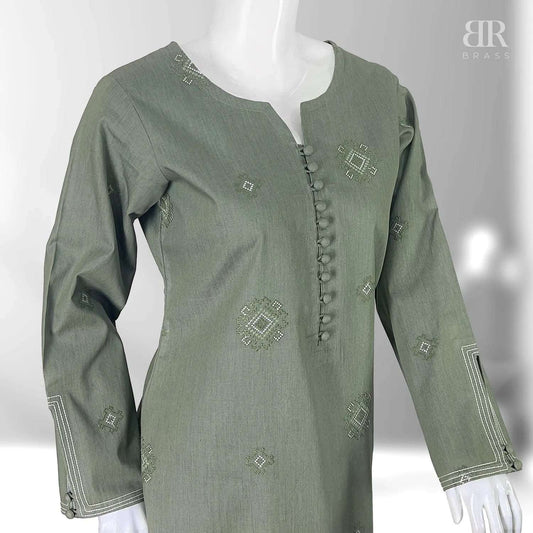 2 Piece - Embroidered Pure Slub Khaddar Stitched Suit (Olive Green)