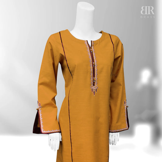 2 Piece - Embroidered Pure Slub Khaddar Stitched Suit (Mustard)