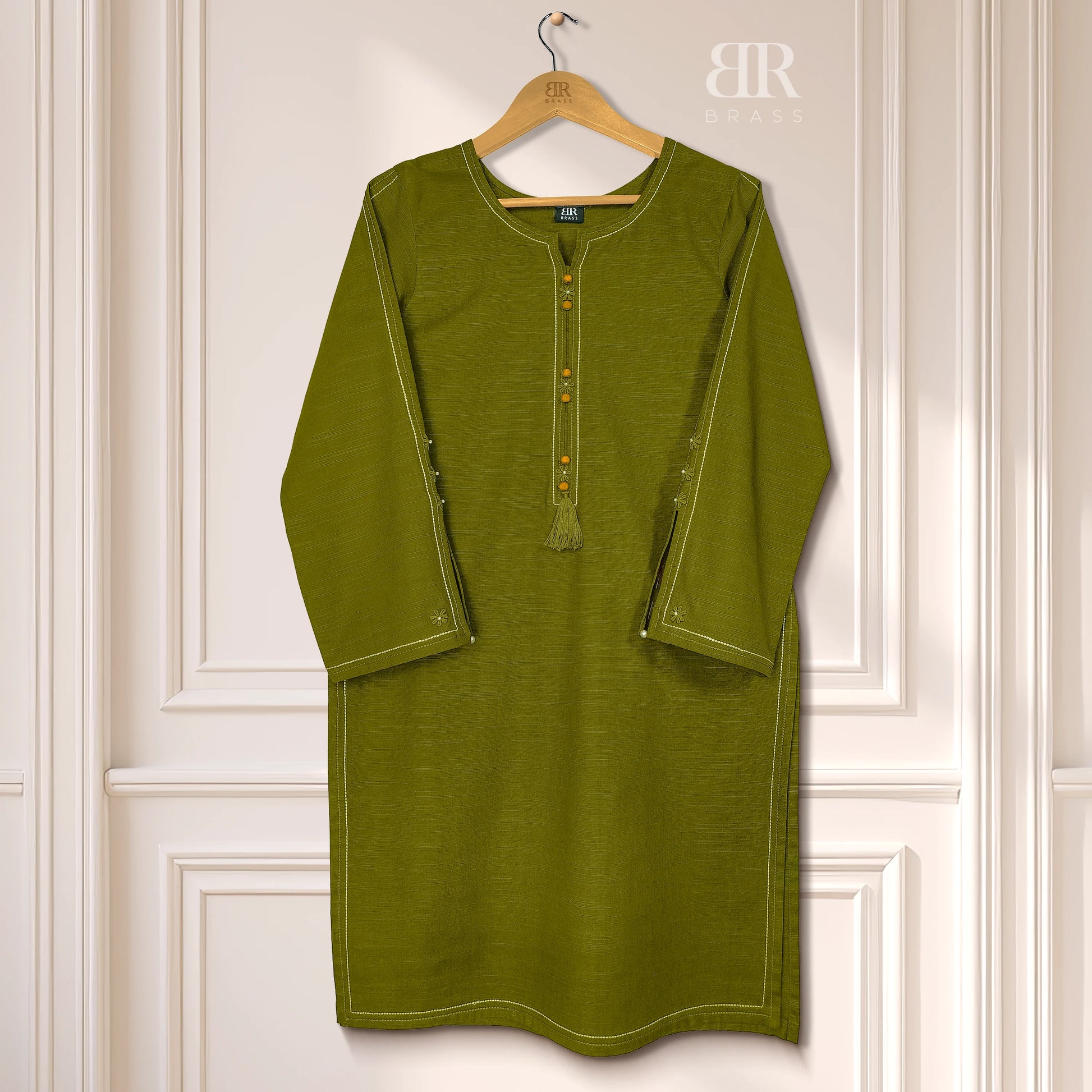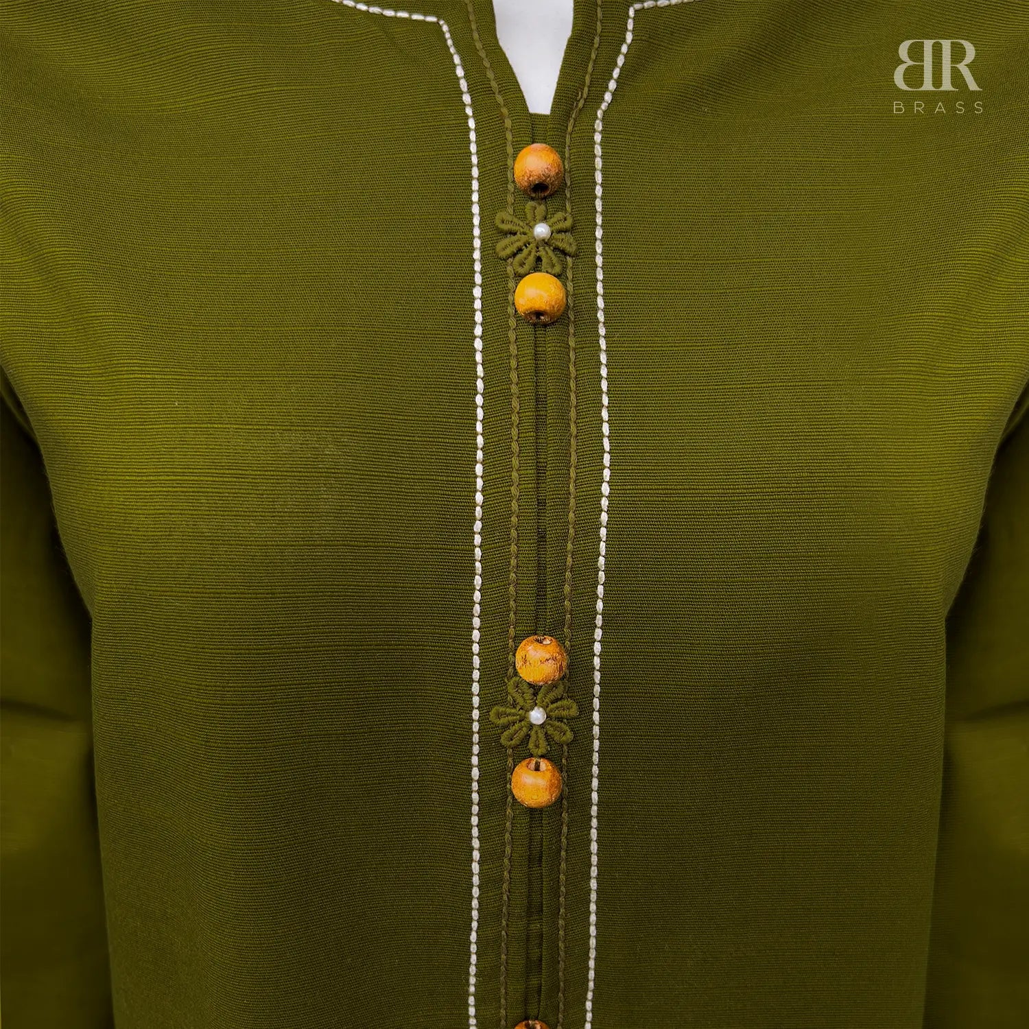 2 Piece - Embroidered Pure Slub Khaddar Stitched Suit (Olive Green)